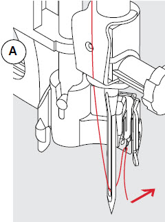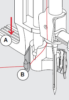6) Diriger le fil autour du crochet B en direction de la droite devant l'aiguille