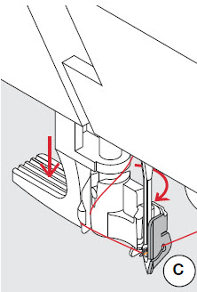 7) Tirer le fil depuis l'avant dans le guide fil C jusqu'à ce qu'il s'accroche (petit crochet métallique) C