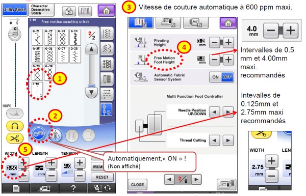 Ce pied à coulisseau de fil qui est placé sur le coupe fil, c’est très simple de coudre des cordons d’un diamètre de 1,5 à 2 mm, à la main libre, avec les griffes escamotés et le point droit.