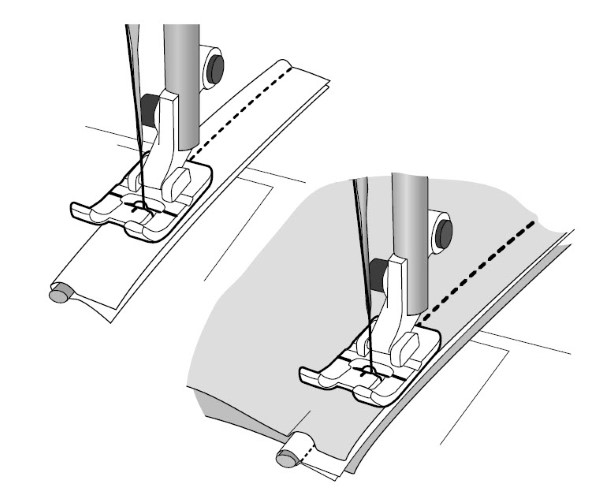 3. Disposez l’ensemble sous le pied pour passepoil, le passepoil dans la rainure sous la semelle du pied. Piquez au un point droit, longueur 2,5. L’autre rainure sert de repère pendant que vous exécutez la couture.