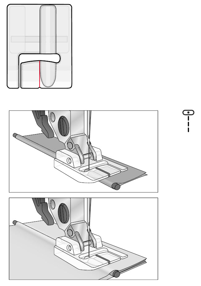 3. Disposez l’ensemble sous le pied pour passepoil, le passepoil dans la rainure sous la semelle du pied. Piquez au un point droit, longueur 2,5. L’autre rainure sert de repère pendant que vous exécutez la couture.