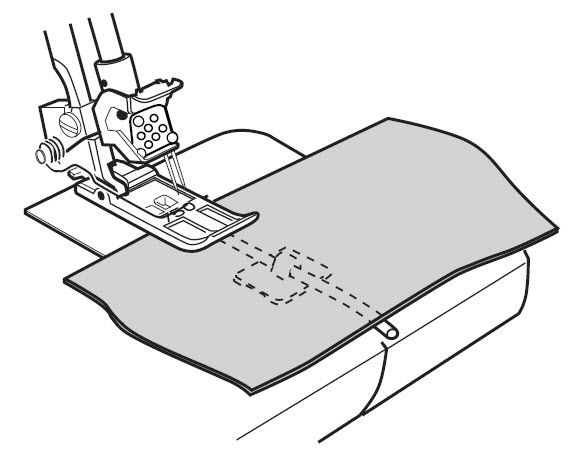 6. Insérez le tissu entre le pied et la ganse.Faites glisser le tissu sous le pied jusqu'aux aiguilles.