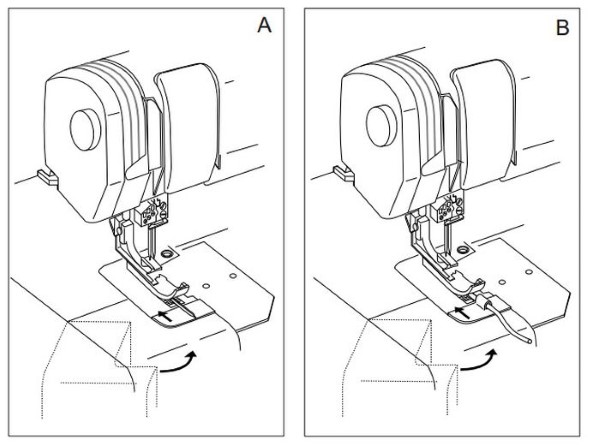 7. Abaissez le pied-de-biche et piquez. (Retenez la ganse derrière le pied lorsque vous commencez à coudre.)