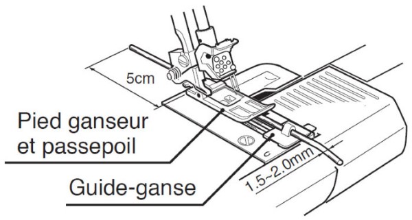 Froncer avec un cordonnet élastique : Enfilez le cordonnet élastique à travers le guideganse et sous le pied, comme pour ganser. Faites glisser le tissu entre le cordonnet élastique et le tissu jusqu'aux aiguilles. Cousez au-dessus du cordonnet élastique. Tirez les deux extrémités de l'élastique pour froncer.
