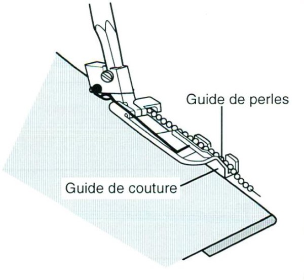 Ce pied spécial permet de poser des bandes perlées, des paillettes montées sur des bandes strass, de ficelles ou cordonnets décoratifs. Ces opérations s’effectuent avec une seule aiguille.