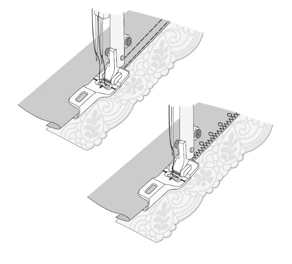 Utilisez le pied pour assembler et plier les bordures avec différentes techniques, comme la dentelle, les bordures brodées ou divers tissus. Utilisez les magnifiques points de 9 mm de PFAFF® pour créer de superbes bordures. Confectionnez de la lingerie en un clin d’oeil, ajoutez de la dentelle pour créer de superbes mouchoirs ou des dessus de table délicats. Ce pied guide facilement la bordure et le tissu de base à travers les ouvertures sur l’avant du pied, pliez le tissu de base et piquez simultanément la bordure en place.