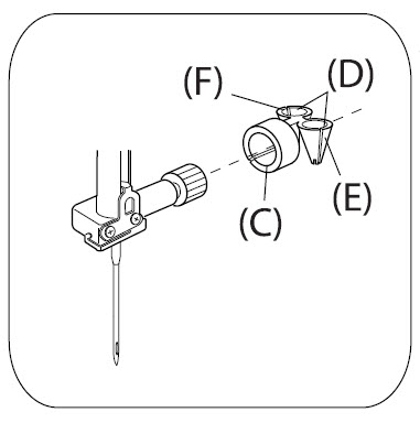 3. Glisser le guide-fil (C) sur la vis de fixation de l'aiguille, avec les embouchures des guide-fil (D) vers le haut, comme indiqué sur la figure.